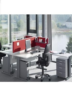 Biroul cu picior C are un panou de legatura optional cu rol de mascare a cablurilor dintre partile verticale ale picioarelor. Ajustarea inaltimii este posibila intr-o marja de 1 cm.