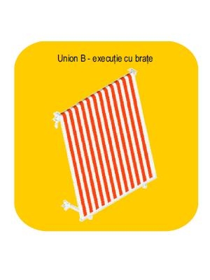 Copertina basculanta cu unghiul bratelor reglabil. Bratele sunt pe o parte fixate de balustrada, iar in partea cealalta prind profilul frontal cu stofa peste fereastra. Union B este recomandata pentru umbrirea si protectia ferestrelor, balcoanelor si teraselor. Latimea maxima a copertinei este de 5 m, deschiderea maxima a stofei este de 2,2 m.