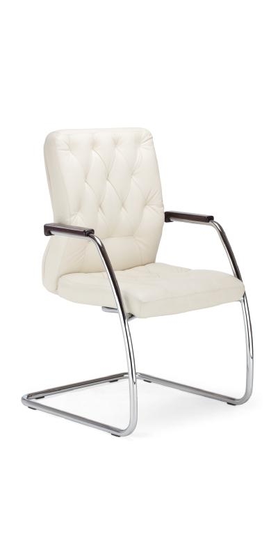 Scaun de vizitator cu rama metalica cromata, baza fixa, sezut si spatar tapitat cu piele SP. Bratele metalice sunt acoperite cu paduri din lemn. Scaunul poate utila si moderniza atmosfera in spatii diverse: sali de asteptare, auditorium, sali de conferinta, sali de sedinta etc.
