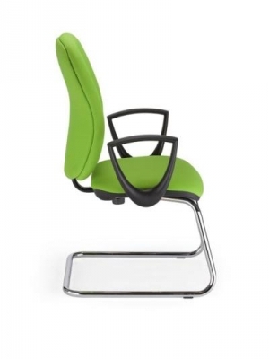 Scaun de vizitator cu rama cromata solida. Sezut si spatar tapitate cu material texil. Bratele sunt fixe din plastic. Scaunul poate utila si moderniza atmosfera in spatii diverse: sali de asteptare, auditorium, sali de conferinta, sali de sedinta etc.