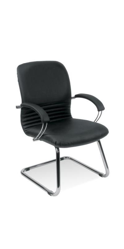 Scaun de vizitator cu rama cromata. Sezut si spatar tapitate cu piele SP. Bratele metalice au paduri moi din piele. Scaunul poate utila si moderniza atmosfera in spatii diverse: sali de asteptare, auditorium, sali de conferinta, sali de sedinta etc
