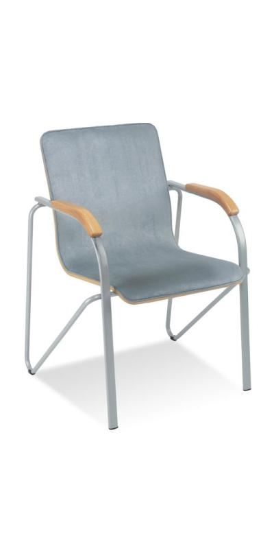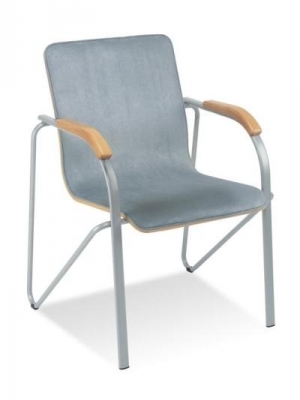 Scaun de vizitator cu rama cromata solida. Sezut si spatar confectionate din lemn si tapitate cu material textil. Bratele fixe sunt metalice cu paduri din lemn. Scaunul poate utila si moderniza atmosfera in spatii diverse: sali de asteptare, auditorium, sali de conferinta, sali de sedinta etc.