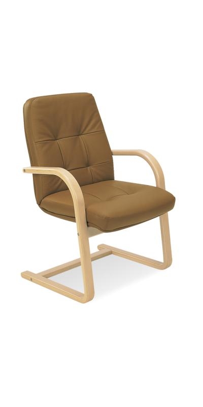 Scaun de vizitator cu rama din lemn masiv. Sezut si spatar tapitate integral cu piele SP. Bratele scaunului sunt fixe din lemn. Scaunul poate utila si moderniza atmosfera in spatii diverse: sali de asteptare, auditorium, sali de conferinta, sali de sedinta etc.
