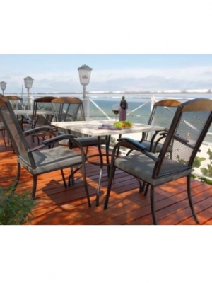 Scaun din tehno-ratan cu cadrul din aluminiu, prevazut cu brate.