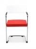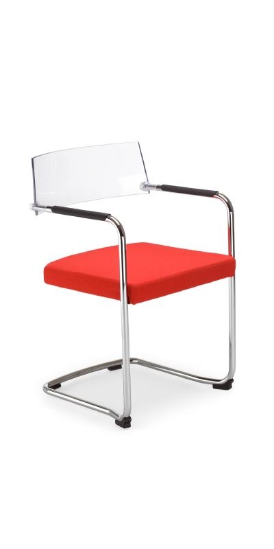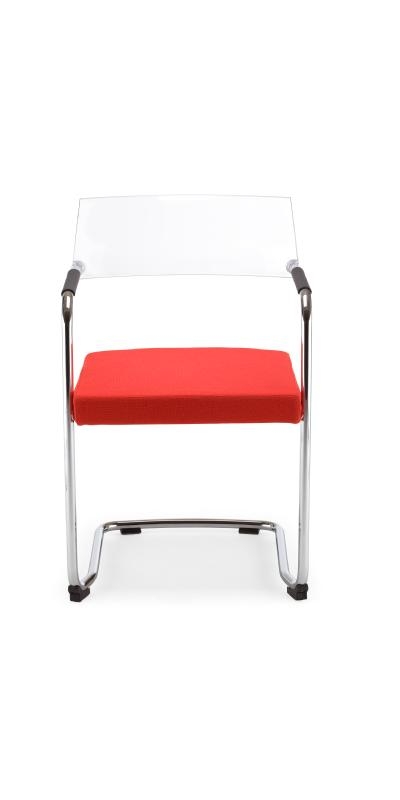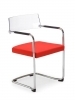 Scaun de vizitator cu rama cromata. Sezut tapitat cu piele SP si spatar confectionat din material plastic transparent. Bratele sunt fixe si au paduri moi. Scaunul poate utila si moderniza atmosfera in spatii diverse: sali de asteptare, auditorium, sali de conferinta, sali de sedinta etc.