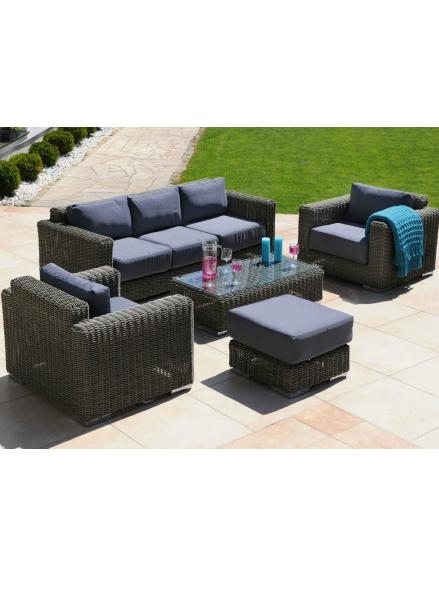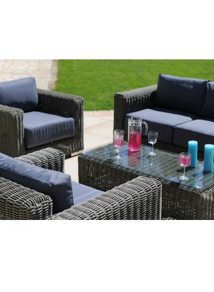 Setul include o masa cu top de sticla, doua fotolii, canapea, taburet si perne.
