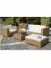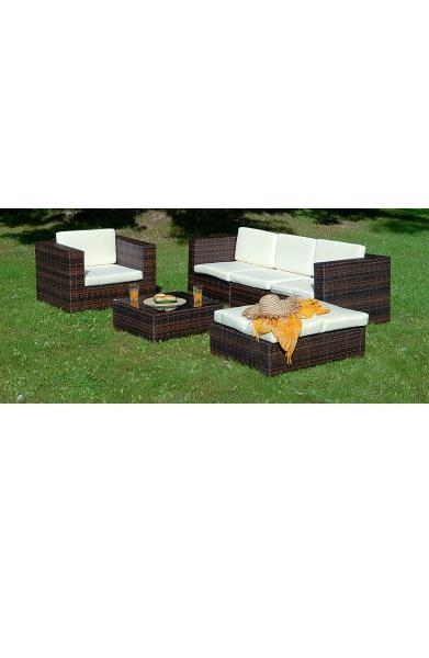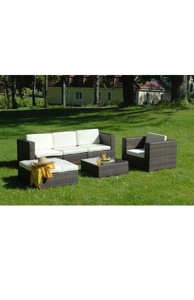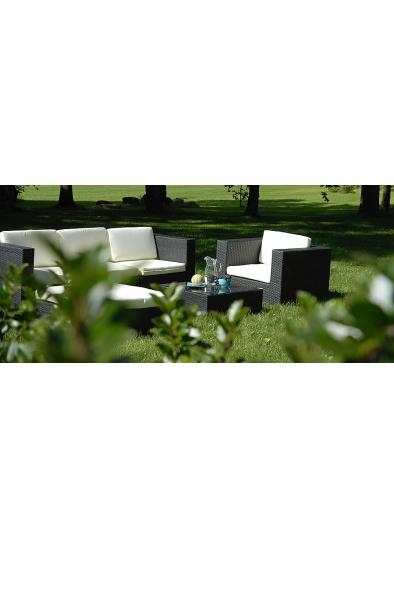 Setul include masa,fotoliu, taburete, canapea formata din trei segmente distincte si pernele.