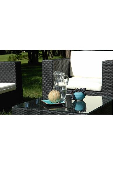 Setul include o masa cu top de sticla, doua fotolii, canapea, taburet si perne.