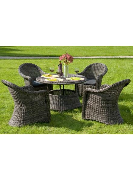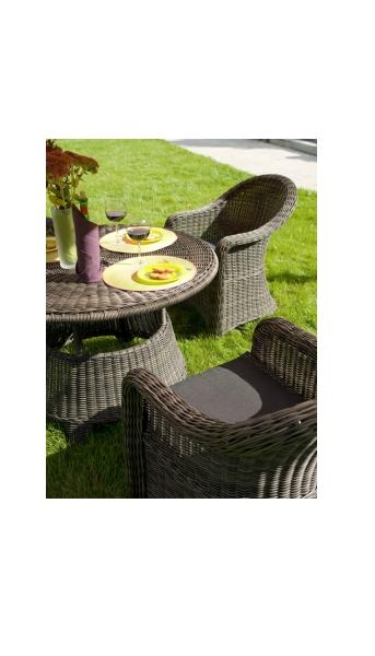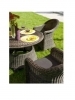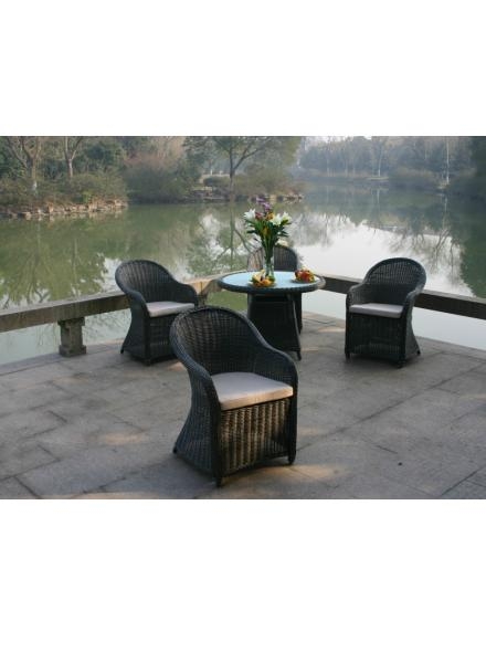 Setul include o masa rotunda cu top din sticla si patru fotolii cu perne.